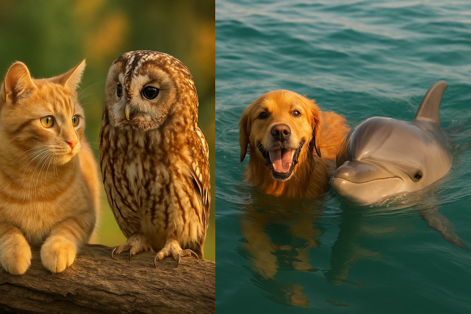 Najdziwniejsze sojusze zwierząt – kot i sowa, pies i delfin?